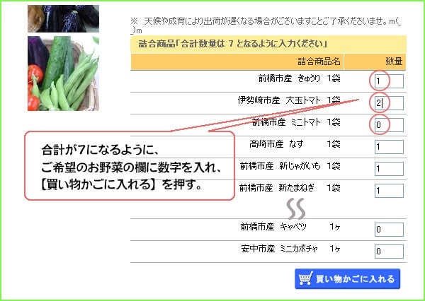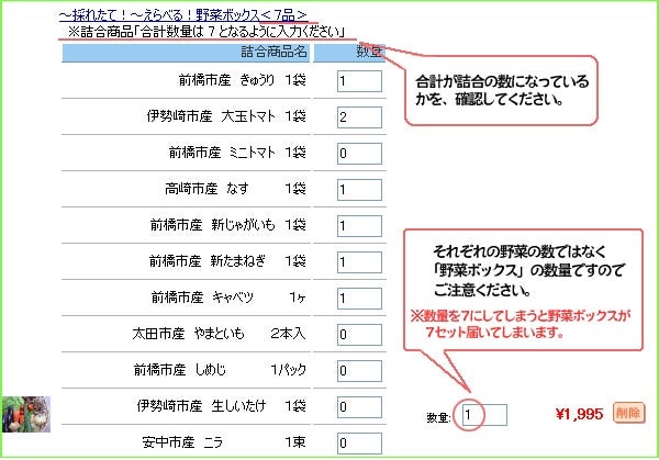 また、【数量:】に入っている数字は【〜採れたて!〜えらべる!野菜ボックス<7品>】の注文数です。
