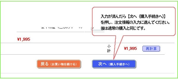 入力が完了しましたら、【次へ(購入手続きへ)】 を押し、購入手続きへと進んでください。