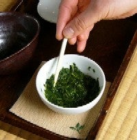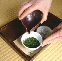 1.茶碗に玉露4g(茶さじ1杯)程度を山形にいれ、そこに45℃前後まで