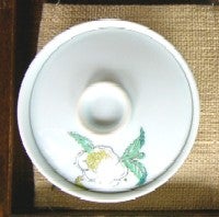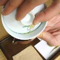 3.茶碗を左手にのせ、右手でふたを少しずらし、そのまま軽くふたを押さえて茶碗とふた