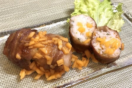 - 豚バラ肉でおにぎり全体を包み込むように巻き、肉巻きロールを作る。