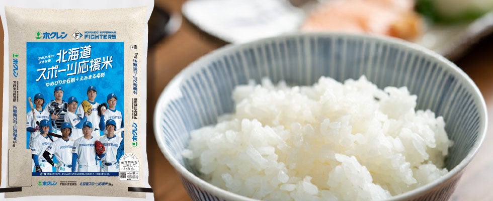 ◆冷めてもおいしい「ファイターズ×ホクレン 北海道スポーツ応援米」ゆめぴりか6割 えみまる4割使用 北海道米の最高峰品種「ゆめぴりか※」と柔らかい食感が特長の「えみまる」を6対4の割合でブレンド。炊き立てはもちろん、冷めてもおいしいのでお弁当やおにぎりにもおすすめです。 ※「北海道米の新たなブランド形成協議会」で定めた、厳しい品質基準に若干満たないゆめぴりかを主に使用しています。 ◆北海道の子ども達の心と身体を育てる活動を応援するお米です ファイターズ北海道スポーツ応援米は、北海道日本ハムファイターズと公益財団法人北海道スポーツ協会、ホクレンがタッグを組み、“北海道を元気に”そして“スポーツを通じて北海道の子ども達を育成”するための活動を展開するためにつくられました。売上の一部(1kgあたり1円)が寄付金となり、その活動を通じて北海道の未来を担う子ども達の健やかな成長を応援します。