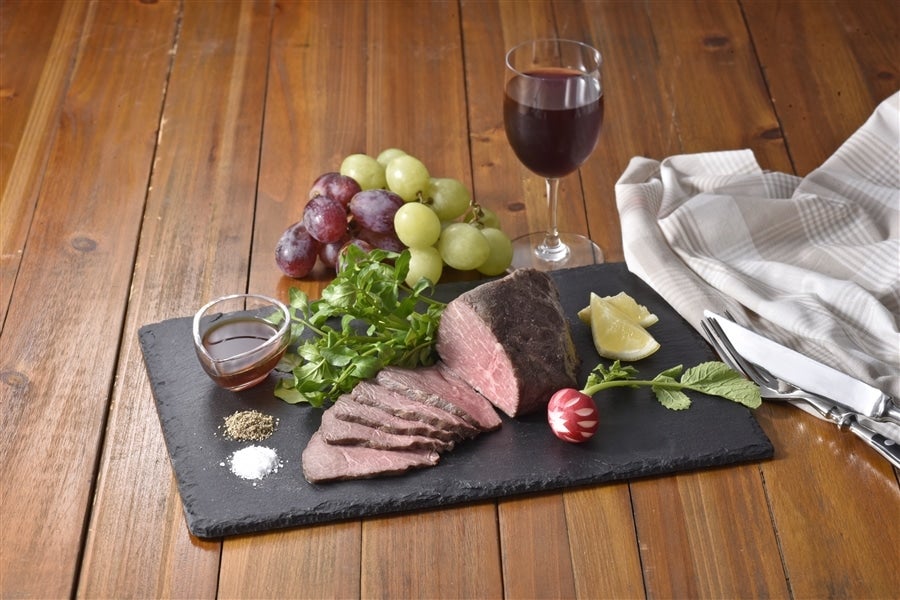 白老牛の内もものみ使用していますので、肉繊維の流れがほぼ統一で柔らかく、脂肪の少ない赤身の多いローストビーフです。