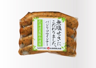 北海道産豚肉を使用し、バジルの風味が調和した無塩せきのウインナーです。