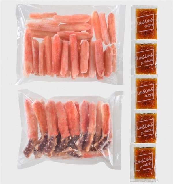 【規格】たらば棒ポーション500g×1、ずわい棒ポーション500g×1、たれ25g×5袋 【産地】たらばがに(北海道)ずわいがに(ロシア) 【賞味期限】製造日含め冷凍(-18℃以下)で30日 【メーカー】北海道ぎょれん