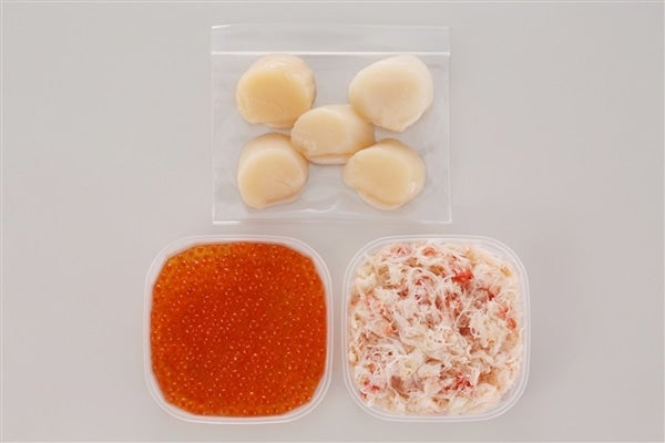 【規 格】おおずわいがにほぐしみ、ほたて貝柱:各100g、いくら醤油漬:80g 各1 【賞味期限】製造日より冷凍保存(-18℃以下)で365日 【メーカー】潟Jネコメ田中水産