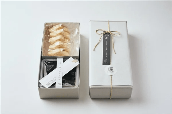 北海道別海町産の牛乳と、北海道産の白花豆を使用した香り高いカフェオレあんを、子牛型の北海道産もち米100%のパリパリ最中種にたっぷり挟んで食べる最中です。