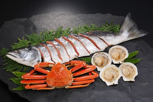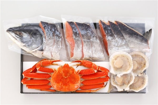 北海道産の秋鮭を塩蔵し、姿切身にした新巻鮭とほたてと蟹の入った豪華な詰合せ