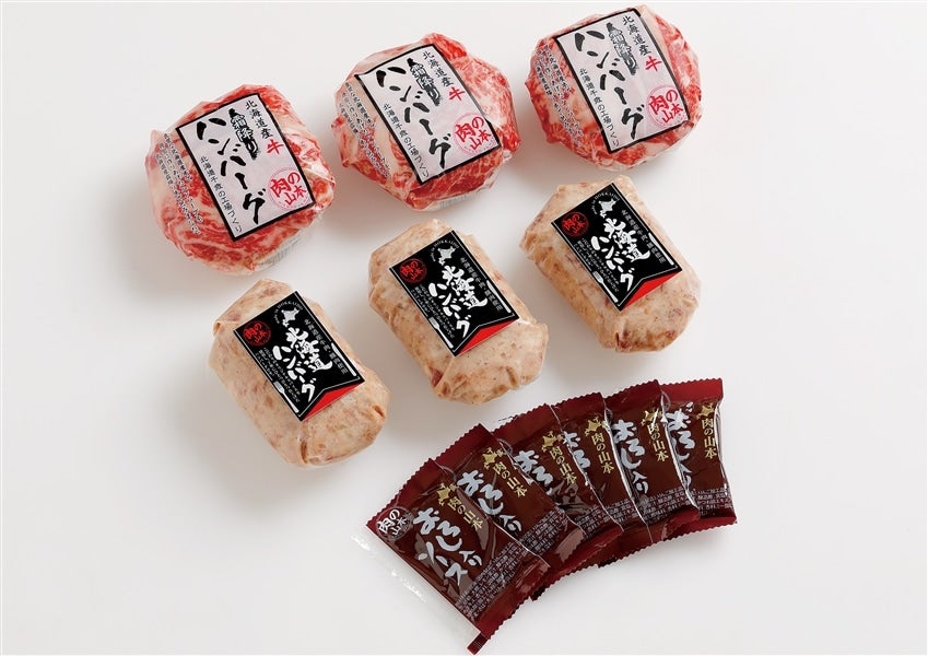 【規 格】 北海道産牛霜降りハンバーグ約150g×3、北海道ハンバーグ約120g×3、おろしソース約15g×6 【賞味期限】 製造日より90日 【保存方法】 要冷凍(-18℃以下) 【販 売 者】 株式会社肉の山本