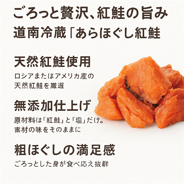 A無添加仕上げ:原材料は「紅鮭」と「塩」だけ。素材の味をそのままに。