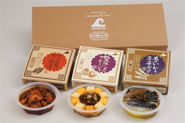 北海道産ほたて貝と細切りにした知床産羅臼昆布を、サイコロ状にカットしたプロセスチェダーチーズと一緒にアヒージョ風にオリーブオイル漬けにしました。