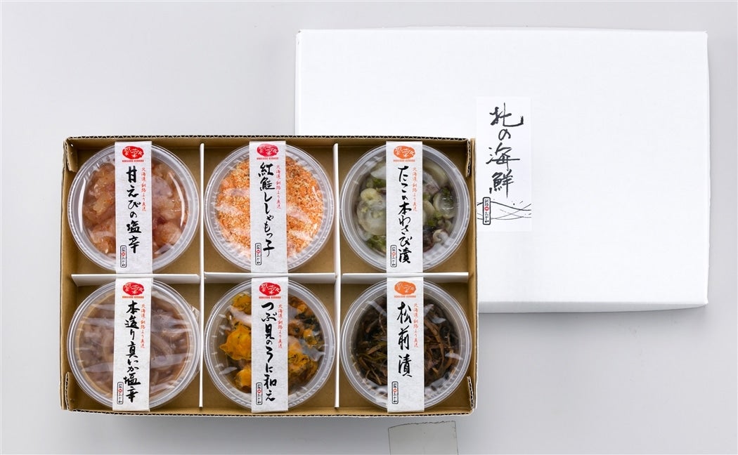 【規 格】たこの本わさび漬け60g、甘えびの塩辛60g、紅鮭ししゃもっ子50g、本造り真いか塩辛60g、つぶ貝のうに和え60g、松前漬60g 【産 地】たこ・つぶ貝(北海道)、甘えび(グリーンランド)、紅鮭(ロシア・アメリカ)、真いか(国内) 【賞味期限】製造日より冷蔵保存(10℃以下)で20日 【メーカー】鰍ィが和