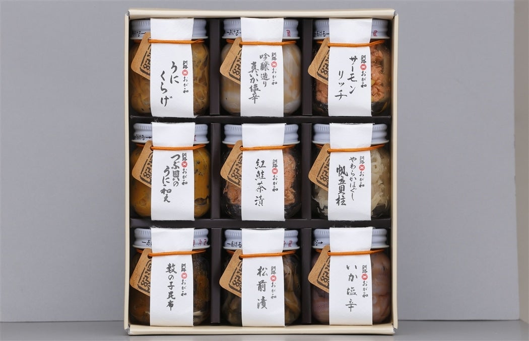 【規 格】紅鮭茶漬30g、やわらかほぐし帆立貝柱30g、サーモンリッチ30g、うにくらげ45g、数の子昆布40g、真いか塩辛45g、特選松前漬40g、つぶ貝のうに和え45g、吟醸造り真いか塩辛45g 【産 地】紅鮭(ロシア・アメリカ)帆立・つぶ貝(北海道)スルメイカ(国内)うにくらげ(マレーシア) 【賞味期限】製造日より冷蔵保存(10℃以下)で30日 【メーカー】鰍ィが和