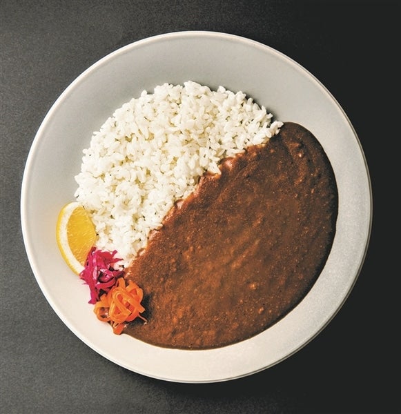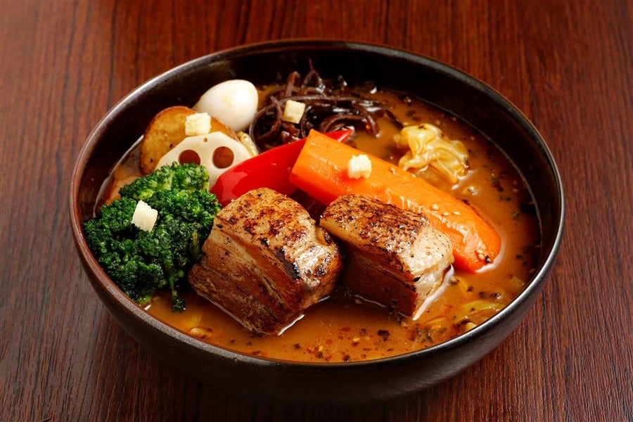 じっくり炒めた野菜の甘みとチキン・ポーク・ビーフの旨味をベースに、南かやべ産の白口浜真昆布、かつおの風味を効かせたスープと、ゴロっと大きな柔らか豚バラ角煮を入れ込んだスープカレー。