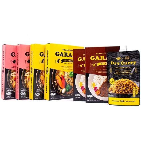 【規 格】札幌スープカレーチキン300g×2、札幌スープカレー豚角煮358g(スープカレー350g・辛みの素8g)×2、札幌ルーカレー200g×2、GARAKUのドライカレー120g×1 【賞味期限】製造日より365日 【保存方法】常温 【販 売 者】絵ARAKU RETAIL