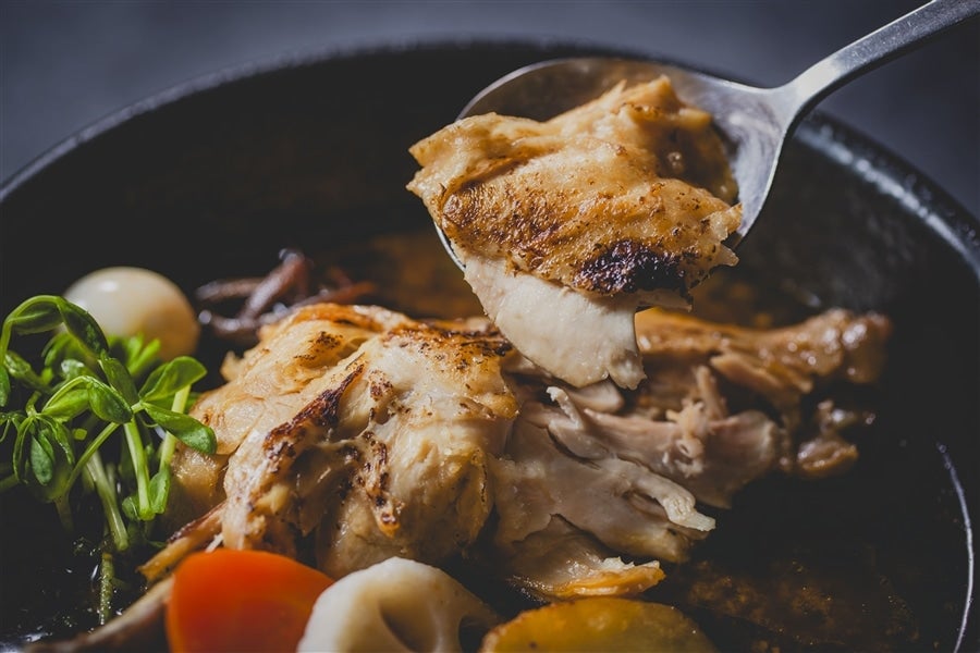 GARAKUの和風ダシと秘伝スパイスを融合させたコク旨スープを再現しました。スプーンでほぐせるほど柔らかな骨付きチキンレッグをまるごと1本入れ込み、別添の香味油を後がけするとレトルトパウチ臭が消え、より店舗の美味しさを楽しむことができます。