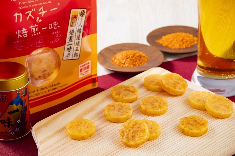 八幡屋礒五郎こだわりの焙煎一味と「カズチー」の出会い。香ばしさ際立つ辛さとカズチーの旨味、後引く辛さがくせになるおつまみです。