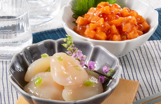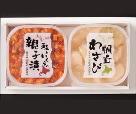 【規 格】鮭いくら親子漬け、ほたてわさび 各180g×各1 【産 地】鮭・鮭卵:北海道斜里産 ほたて:北海道産 【賞味期限】製造日より冷凍(-18℃以下)365日 【メーカー】(株)丸あ野尻正武商店