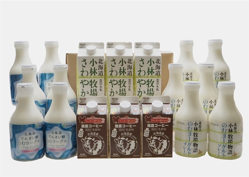 【規 格】酪農コーヒー:500ml×3本 小林牧場物語のむヨーグルトプレーン:500g×6本 北海道てんさい糖のむヨーグルト:500g×6本 小林牧場物語さわやか牛乳:1,000ml×3本 【賞味期限】酪農コーヒー:16日 小林牧場物語のむヨーグルトプレーン:22日 北海道てんさい糖のむヨーグルト:22日 小林牧場物語さわやか牛乳:13日 【保存方法】要冷蔵10℃以下 【販 売 元】新札幌乳業(株)
