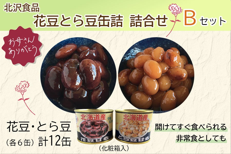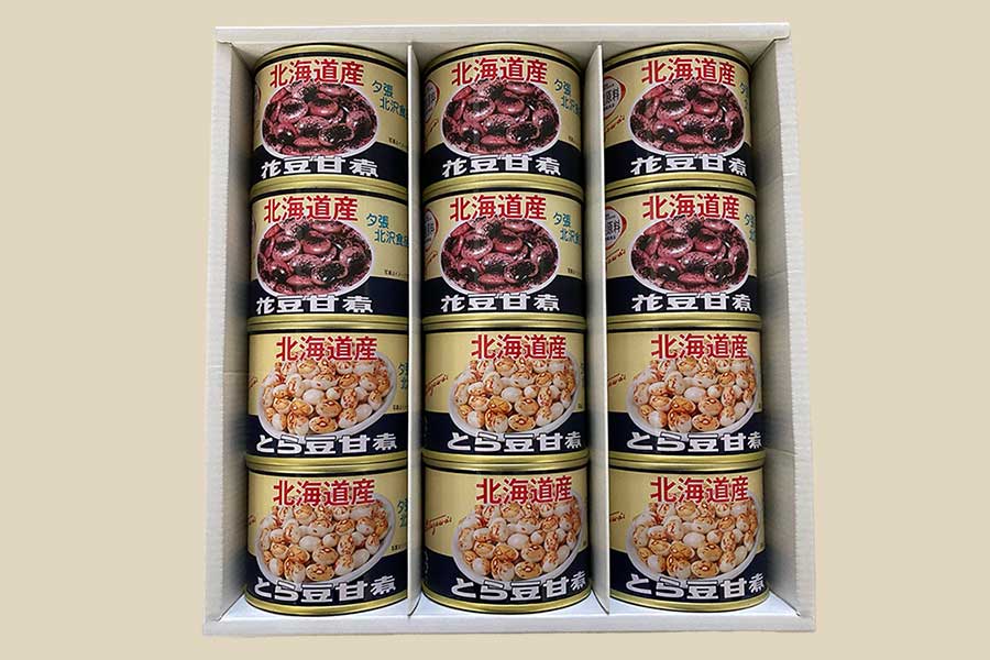 夕張市内にて、大正10年(1916年)に創業した「北沢食品工場」。 北海道産豆を使い、夕張出身の方には懐かしい味を、今も守り続けています。 ●花豆:紫花豆を100%使用。大粒の実のみを選り分けて煮込みました。 ほくほくとした肉質、しっかりとした豆の味わいがお好きな方におすすめです。 ●とら豆:皮がやわらかく、粘りのある食感。濃厚ながら上品な風味が楽しめます。 【確認事項】 ・「のし」対応は承っておりません。予めご了承ください。
