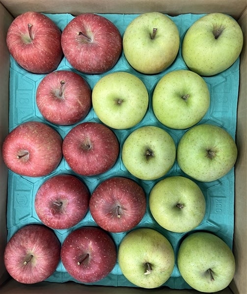 定番のサンふじと黄緑色の見た目が鮮やかで、酸味はほとんどなく、しっかりとした甘みの王林の詰め合わせです。