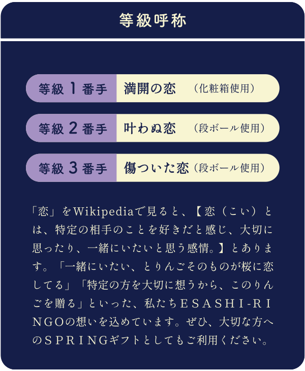 3等級の商品である「傷ついた恋」の由来は、残念ながら傷ついてしまったけれど、美味しさを楽しんでいただきたいという思いを込めました。