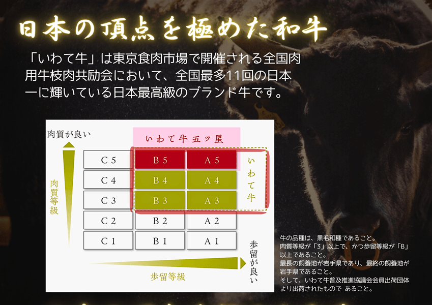 日本の頂点を極めた和牛です。いわて牛は東京食肉市場で開催される全国肉用牛枝肉共励会において、全国最多11回の日本一に輝いている日本最高級のブランド牛です!