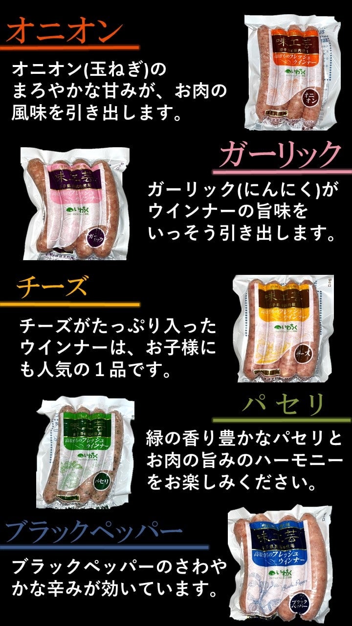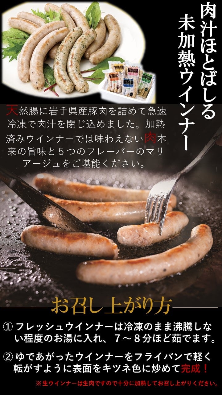 岩手県産豚肉と自然の素材を天然羊腸に詰めた5種の生ウインナー詰合せです。