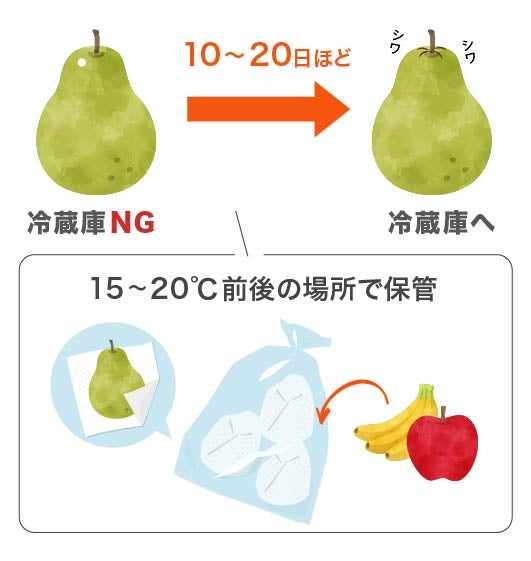 洋ナシは、樹上では完熟しないため、お客様のお手元に到着後に「追熟」をおこなっていただくことで、おいしくお召し上がりいただけます。