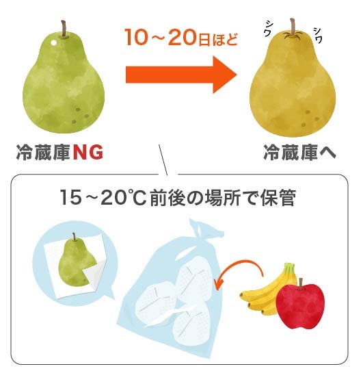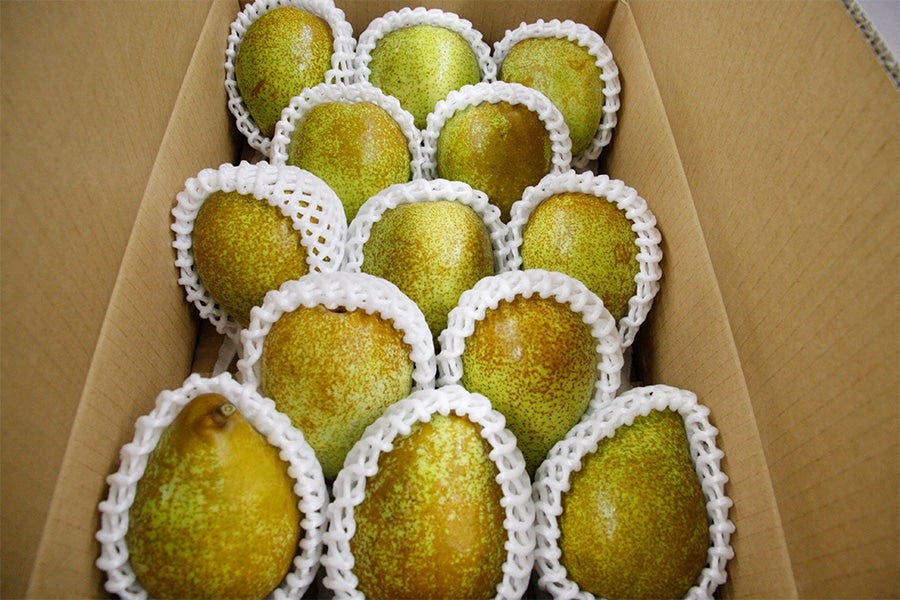 洋ナシは、樹上では完熟しないため、お客様のお手元に到着後に「追熟」をおこなっていただくことで、おいしくお召し上がりいただけます。