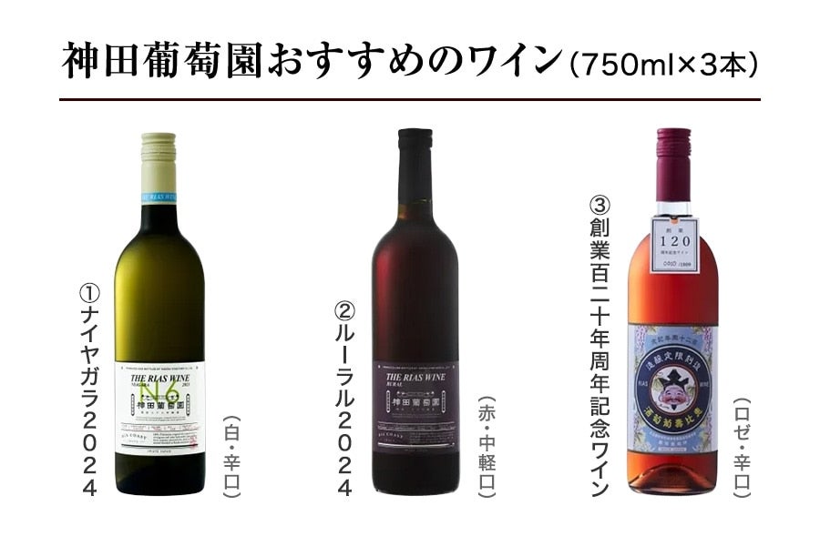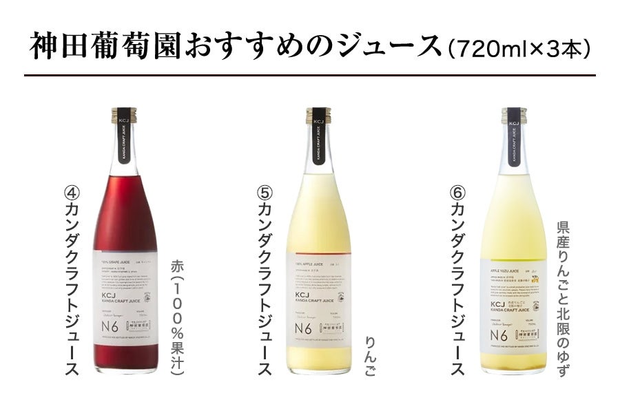 ■ワイン(750ml×3本) @ナイヤガラ2024(白・辛口) Aルーラル2024(赤・中軽口) B創業120周年記念ワイン(ロゼ・辛口) ■ジュース(720ml×3本) Cカンダクラフトジュース赤(100%果汁) Dカンダクラフトジュースりんご Eカンダクラフトジュース県産りんごと北限のゆず