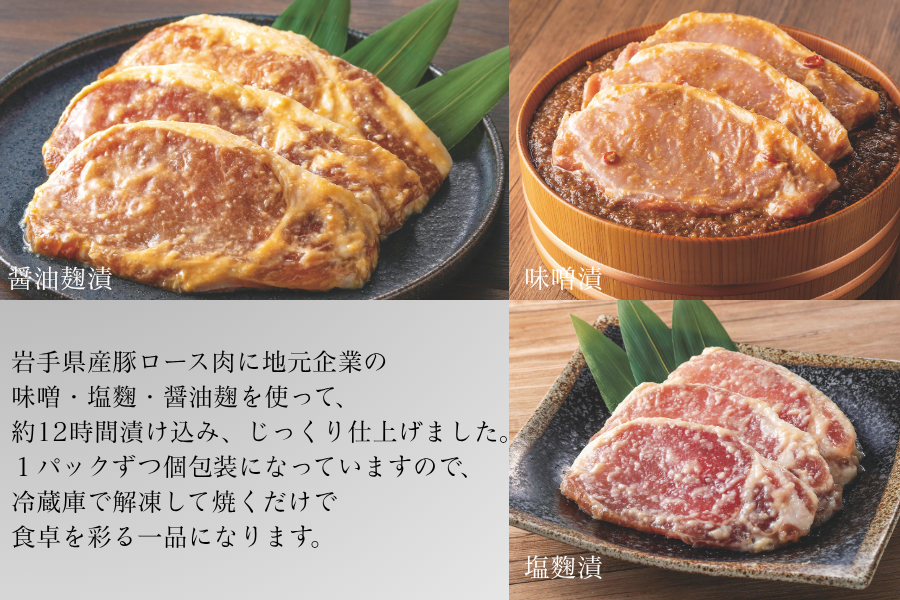 岩手県産豚ロース肉に地元企業の味噌・塩麹・醤油麹を使って、約12時間漬け込み、じっくり仕上げました。1パックずつ個包装になっていますので、冷蔵庫で解凍して焼くだけで食卓を彩る一品になります。