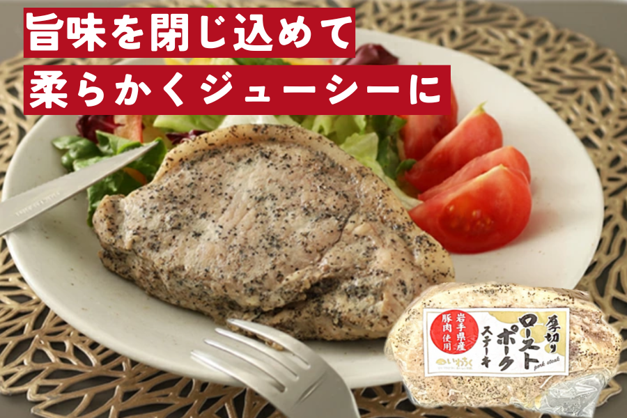 一次加熱後に、低温で真空調理し、お肉の繊維が硬くなる手前の温度でゆっくり加熱していきます。厚切りなのにとっても柔らかく、ジューシーなローストポークステーキをご家庭で楽しめます!