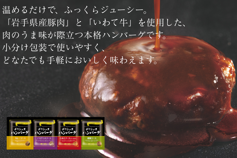 温めるだけで、ふっくらジューシー。 「岩手県産豚肉」と「いわて牛」を使用した、肉の旨みが際立つ本格ハンバーグです。 小分け包装で使いやすく、どなたでも手軽においしく味わえます。