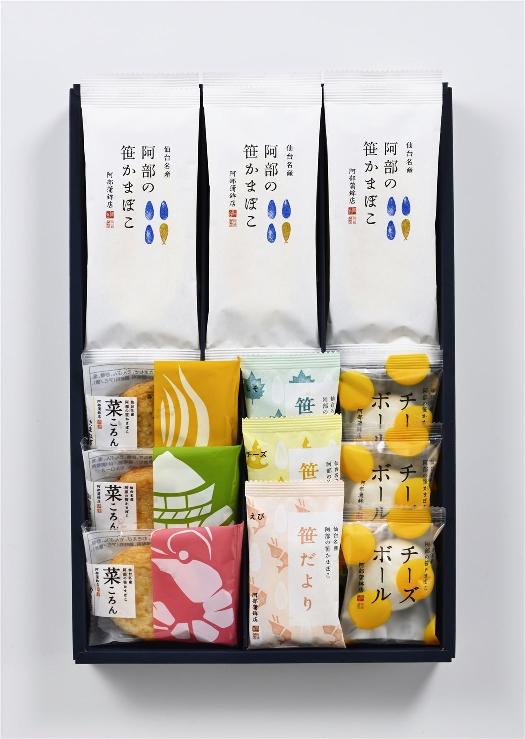 伊達家の家紋「竹に雀」にちなんで名づけられた仙台名産「笹かまぼこ」を、伝統を守りつつ美味しさを日々追及しているのが阿部蒲鉾店です。魚の旨味と食感にこだわった阿部かま看板商品”阿部の笹かまぼこ”やクリームチーズ入り蒸しかまぼこ“チーズボール”、3種の味が楽しめるミニサイズの笹かまぼこ”笹だより”、素材の味を活かした揚げかまぼこ“菜ころん”といったバラエティ豊かな詰合せをご用意しました。徹底的に追及した原料と職人の技法で実現した阿部蒲鉾店の”こだわり”をぜひお楽しみください。