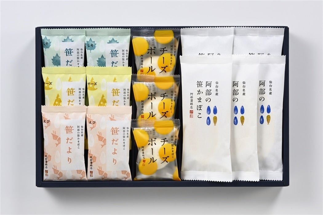 伊達家の家紋「竹に雀」にちなんで名づけられた仙台名産「笹かまぼこ」を、伝統を守りつつ美味しさを日々追及しているのが阿部蒲鉾店です。魚の旨味と食感にこだわった阿部かま看板商品”阿部の笹かまぼこ”やクリームチーズ入り蒸しかまぼこ“チーズボール”、3種の味が楽しめるミニサイズの笹かまぼこ”笹だより”といったバラエティ豊かな詰合せをご用意しました。徹底的に追及した原料と職人の技法で実現した阿部蒲鉾店の”こだわり”をぜひお楽しみください。