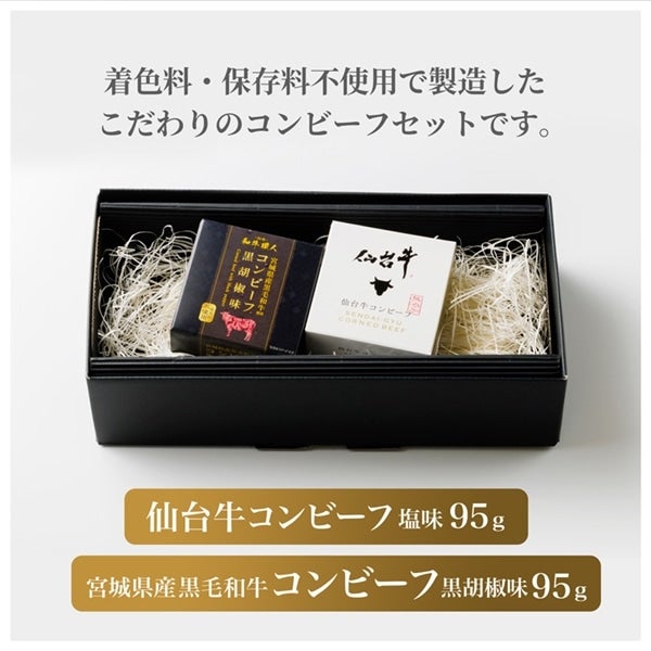 仙台牛コンビーフと宮城県産黒毛和牛コンビーフ黒胡椒味の食べ比べセットです。