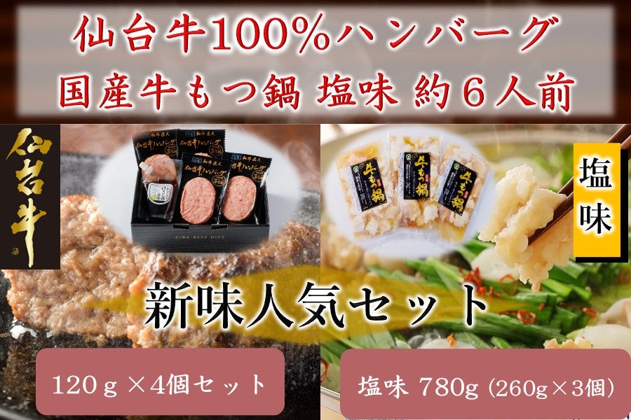 新味人気セット<仙台牛100%ハンバーグ120g×4個+国産牛もつ鍋 塩味 780g(260g×3個)>