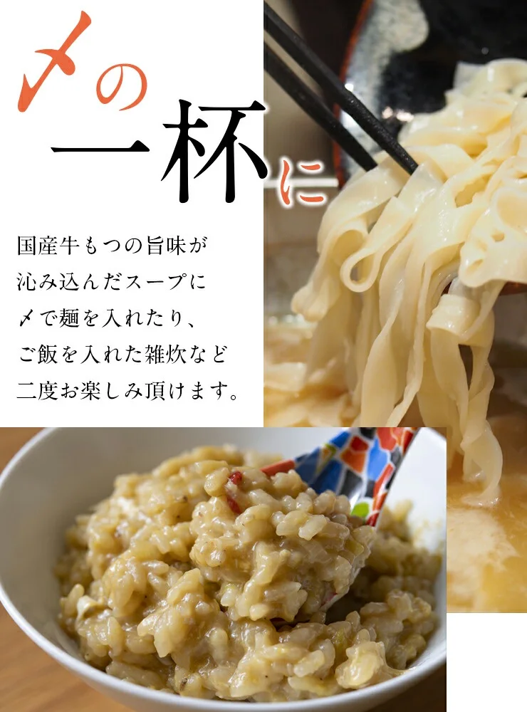 国産牛もつとスープが一緒に入っているので、もつを下茹でする手間が無く、約500tの水を加え、お好みの野菜を入れて煮込むだけ!