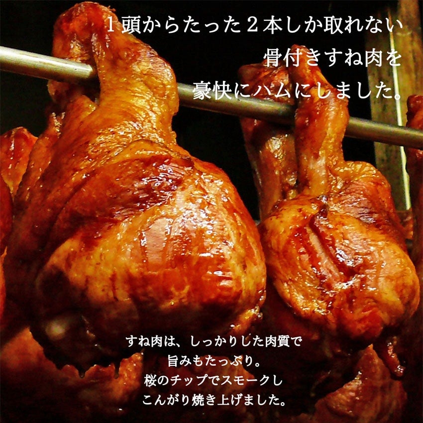 1頭から2本しか取れない骨付きモモ肉で作った、希少なハムです。ドイツ古来の製造方法に限りなく近づけ、長時間塩蔵し熟成させたモモ肉を、桜の原木でスモークしました。