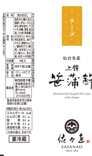 魚肉(たら(輸入又は国産)、きちじ、ぐち)、卵白(卵を含む)、チーズ、砂糖、清酒、食塩、でん粉(馬鈴薯、とうもろこし)、みりん、利尻昆布だし、魚介エキス、食物せんい/調味料(アミノ酸等)、保存料(ソルビン酸(K))、乳化剤、カロチノイド色素