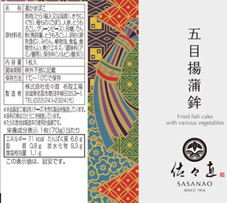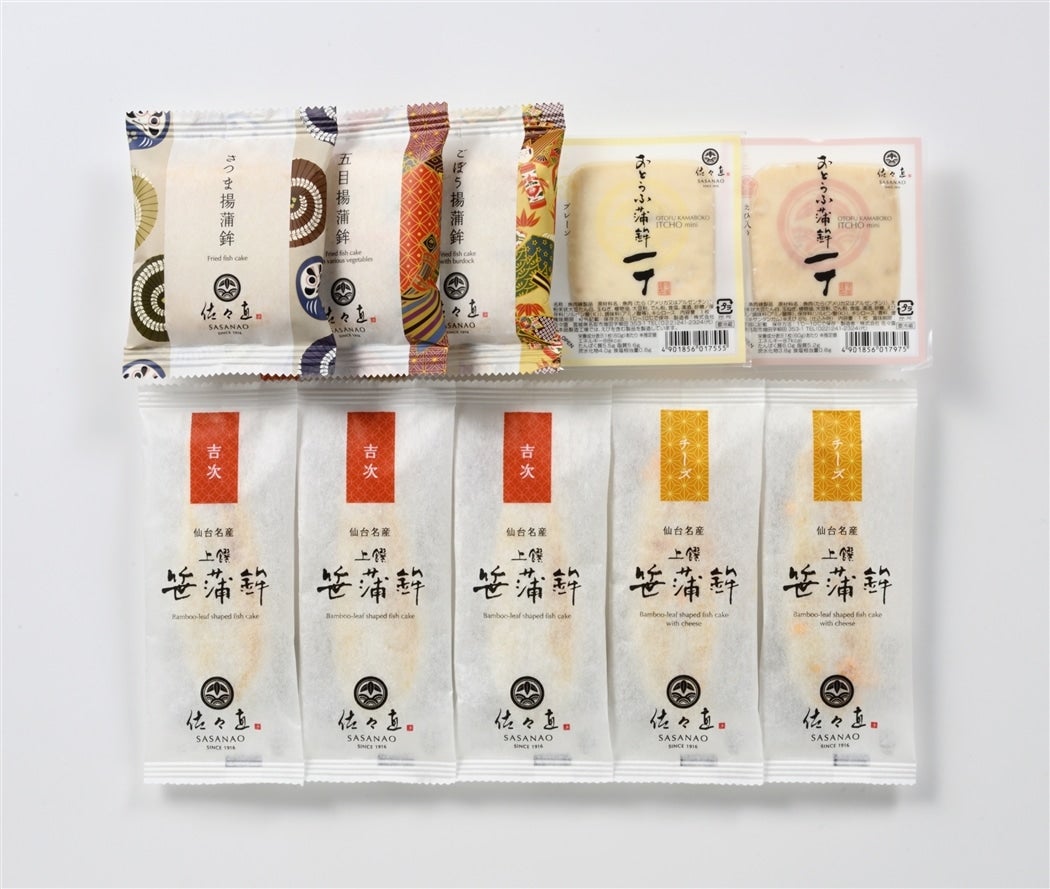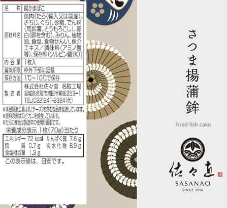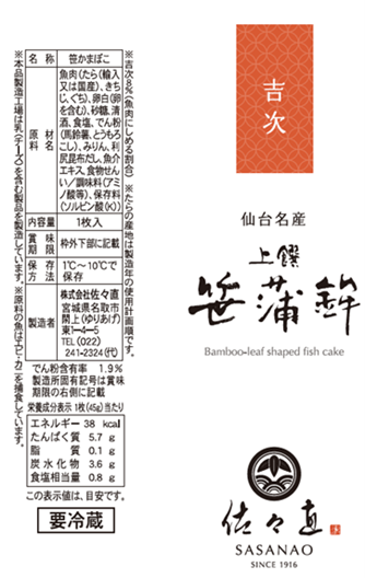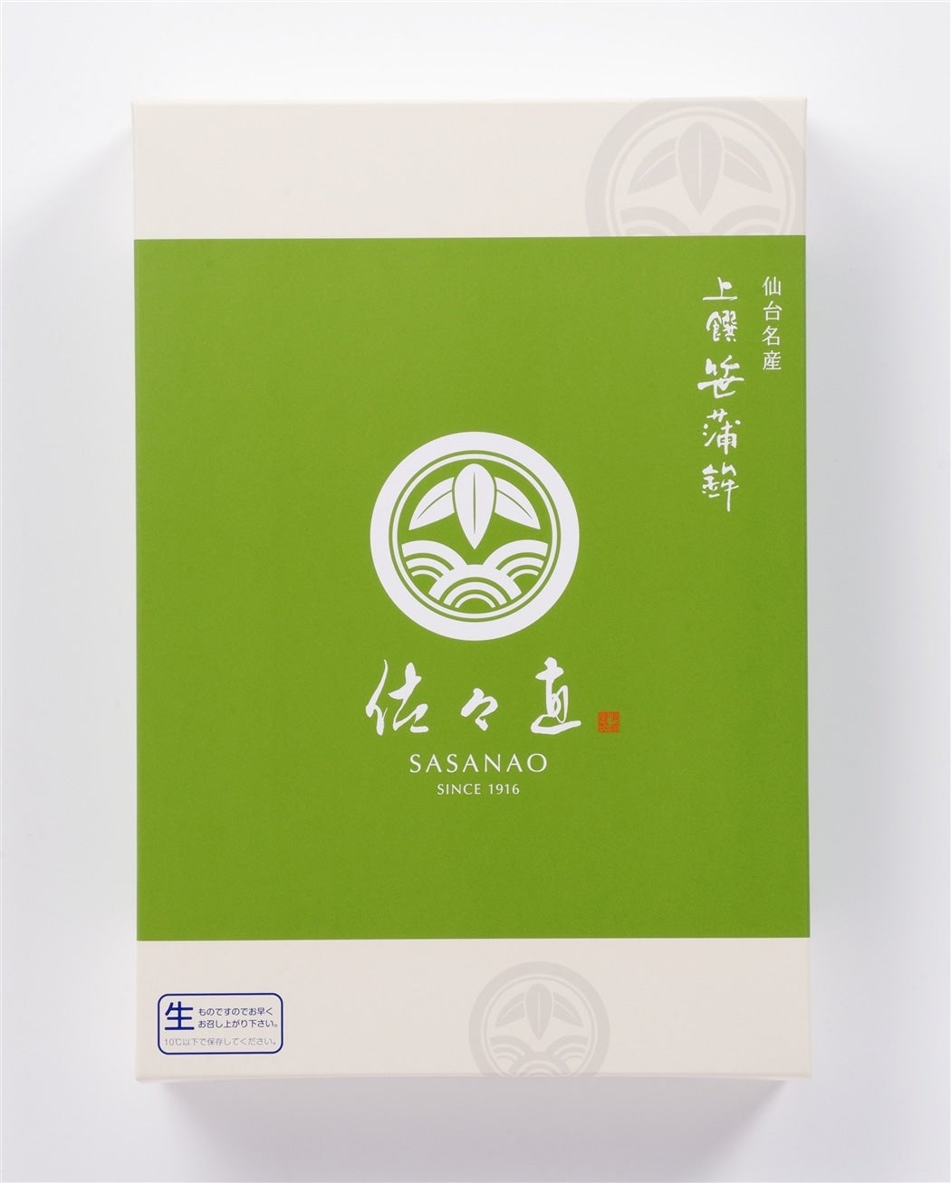 大正5年創業の佐々直は、笹かまぼこのルーツと言われる「手のひら蒲鉾」を開発。こだわりの笹かまぼこは、高級魚吉次を使用した特製のすり身にさっぱりとした後味になるようにオリジナルの地酒の純米酒を配合。遠赤外線と近赤外線で約700度で4分程度じっくり焼き上げふっくらと仕上げます。お魚の上品な香りとお魚の旨味をしっかりと感じられる笹かまぼこです。