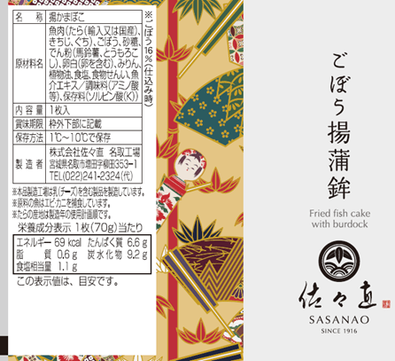 魚肉(たら(輸入又は国産)、きちじ、ぐち)、ごぼう、砂糖、でん粉(馬鈴薯、とうもろこし)、卵白(卵を含む)、みりん、植物油、食塩、食物せんい、魚介エキス/調味料(アミノ酸等)、保存料(ソルビン酸(K))