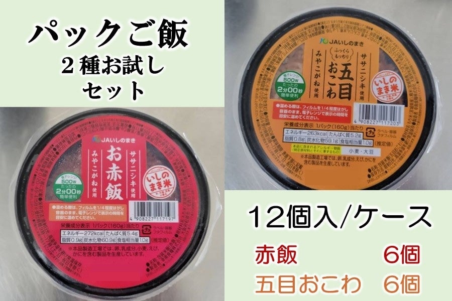 JA管内で生産された、ササニシキともち米(みやこがね)を使用した、簡単便利な炊飯パックの詰合せ商品です。商品ラインナップは、赤飯、五目おこわの2種。いずれも電子レンジで2分加熱するだけで調理でき大変便利です。