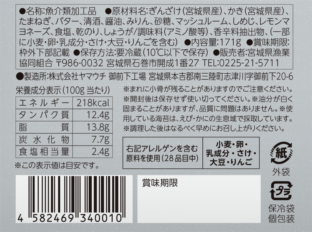 ぎんざけ(宮城県産)、かき(宮城県産)、たまねぎ、バター、清酒、醤油、みりん、砂糖、マッシュルーム、しめじ、レモンマヨネーズ、食塩、乾のり、しょうが/調味料(アミノ酸等)、香辛料抽出物、(一部に小麦・卵・乳成分・さけ・大豆・りんごを含む)