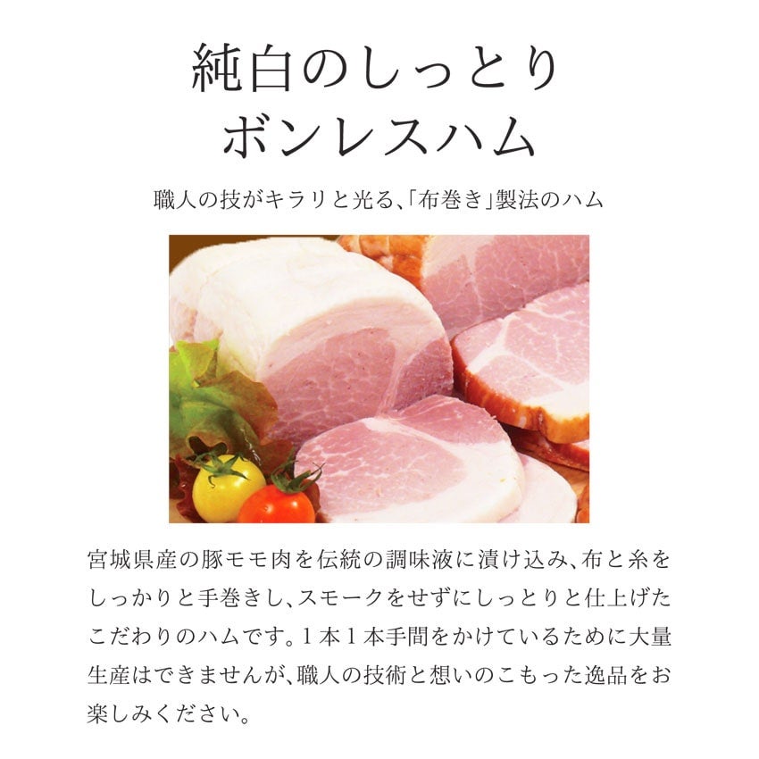 豚モモ肉(宮城県産)、食塩、砂糖、香辛料/リン酸塩(Na)、酸化防止剤(V.C)、発色剤(亜硝酸Na、硝酸K)