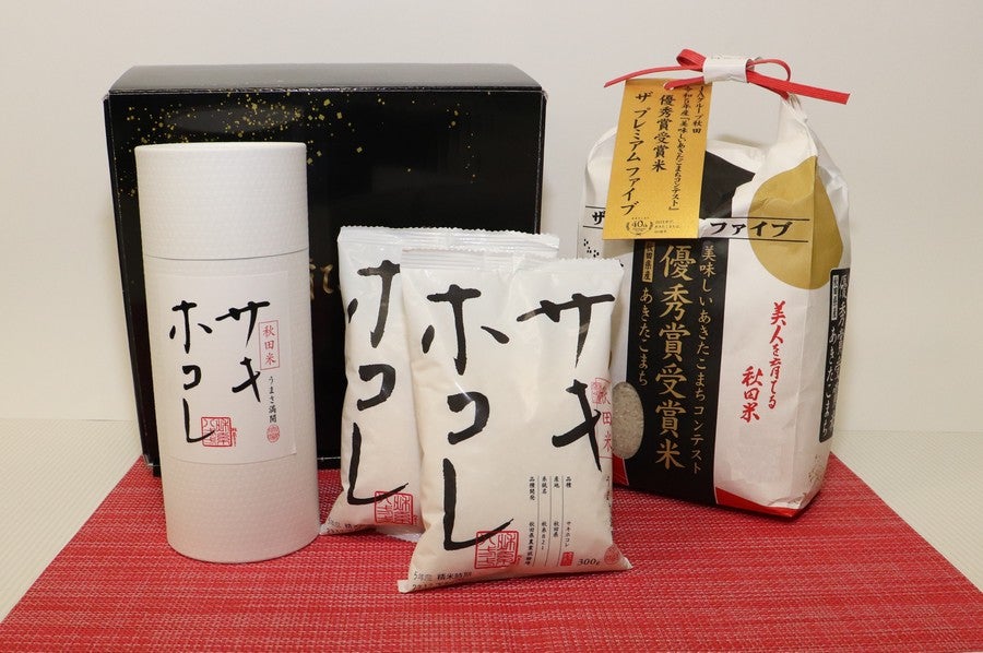 秋田のトップ5の生産者が作ったあきたこまち「ザプレミアムファイブ」と秋田最上位品種「サキホコレ」小袋のギフトセットです