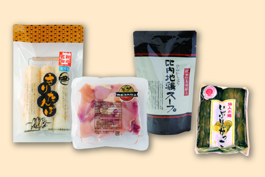 「秋田県産比内地鶏」・「きりたんぽ」・「比内地鶏スープ」の3点セットに「いぶりがっこ」が付いています。