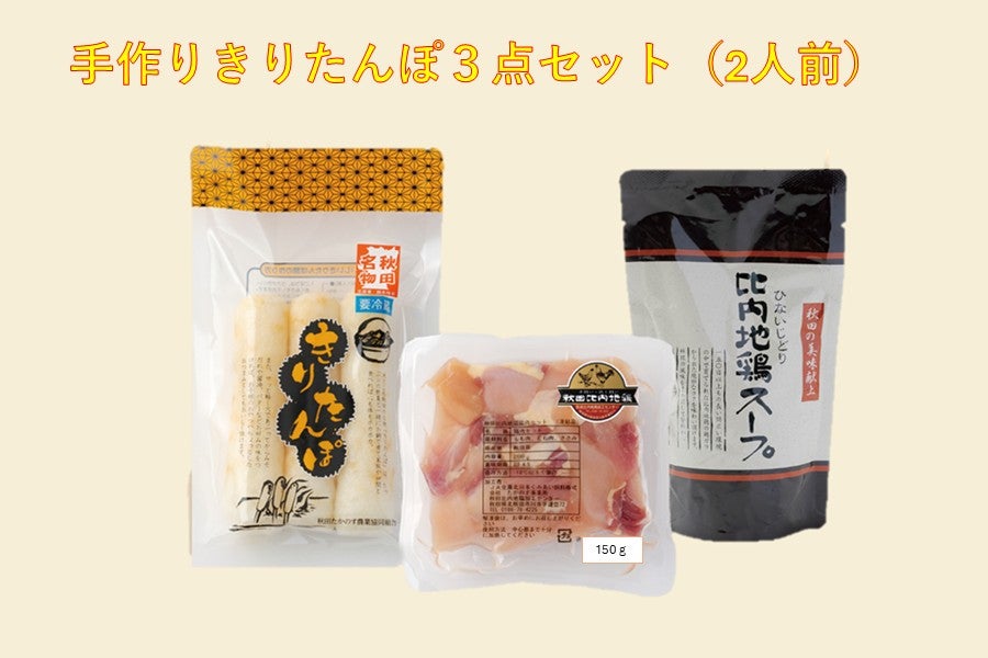 「秋田県産比内地鶏」・「きりたんぽ」・「比内地鶏スープ」の3点セットになります。