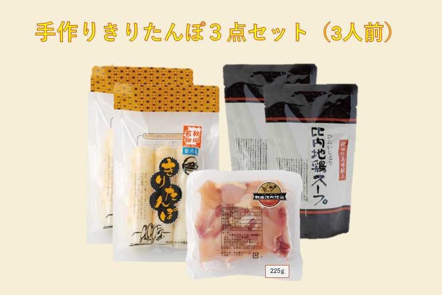 「秋田県産比内地鶏」・「きりたんぽ」・「比内地鶏スープ」の3点セットです。